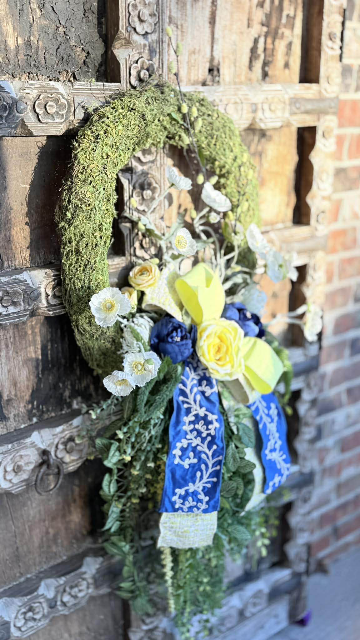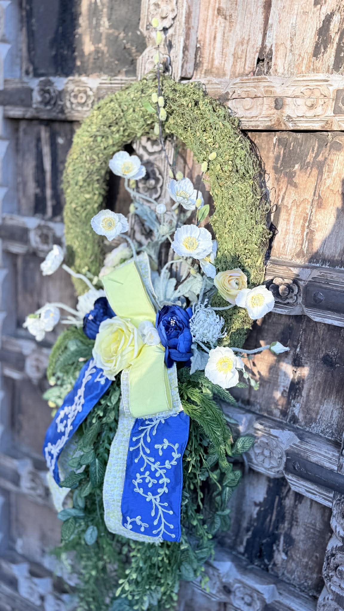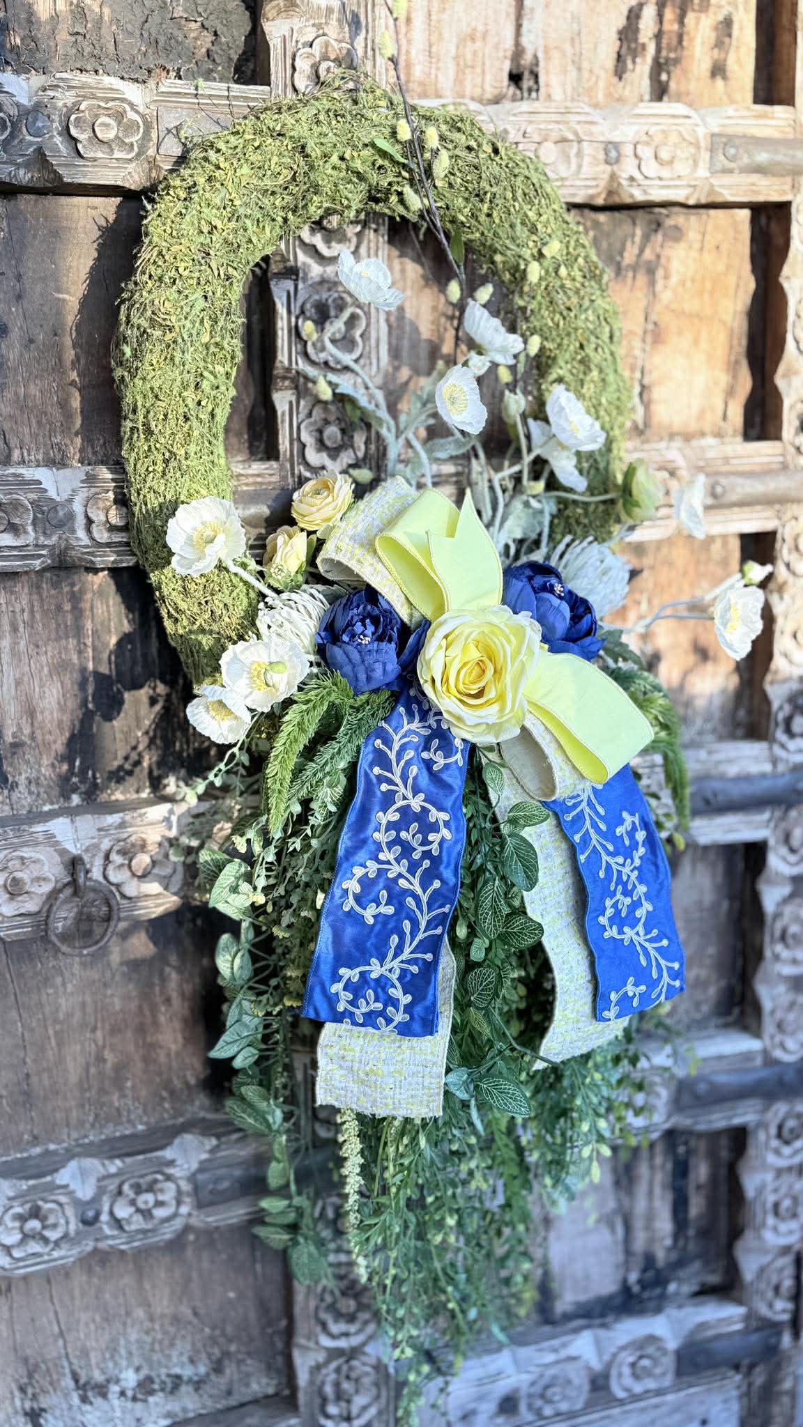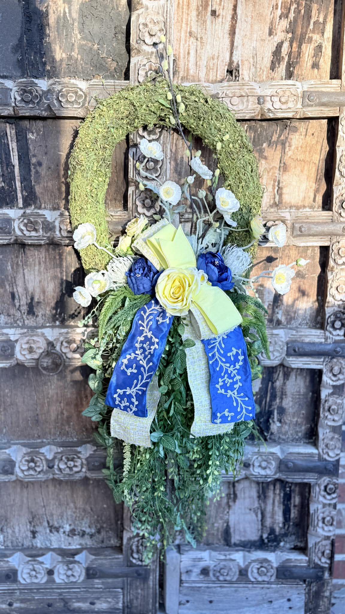Anchored by a thick, verdant moss-covered frame, the design features a lush focal point of velvety navy peonies and a radiant yellow center rose. We’ve added a playful, airy energy with long-stemmed white poppies and delicate pussy willow branches that stretch upward, while a heavy cascade of mixed garden greenery tumbles down for a dramatic silhouette. It’s finished with a stunning double-layered designer bow—combining a crisp, sunny yellow ribbon with a rich royal blue featuring intricate white embroidery. It’s the ultimate statement for the host who appreciates a traditional look with a very swanky, modern twist.